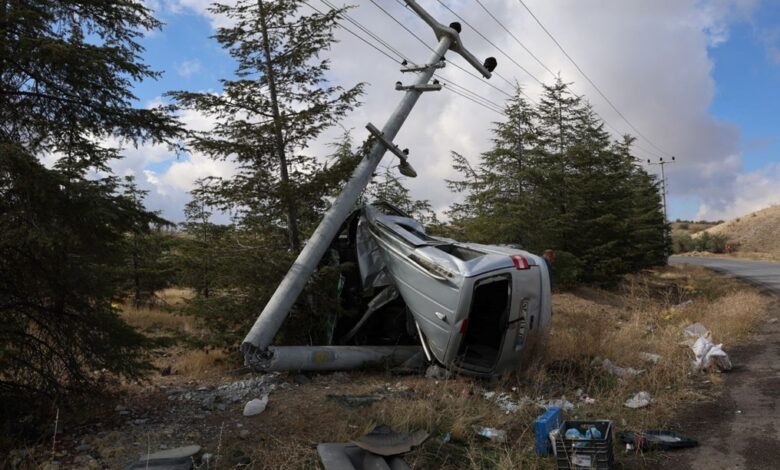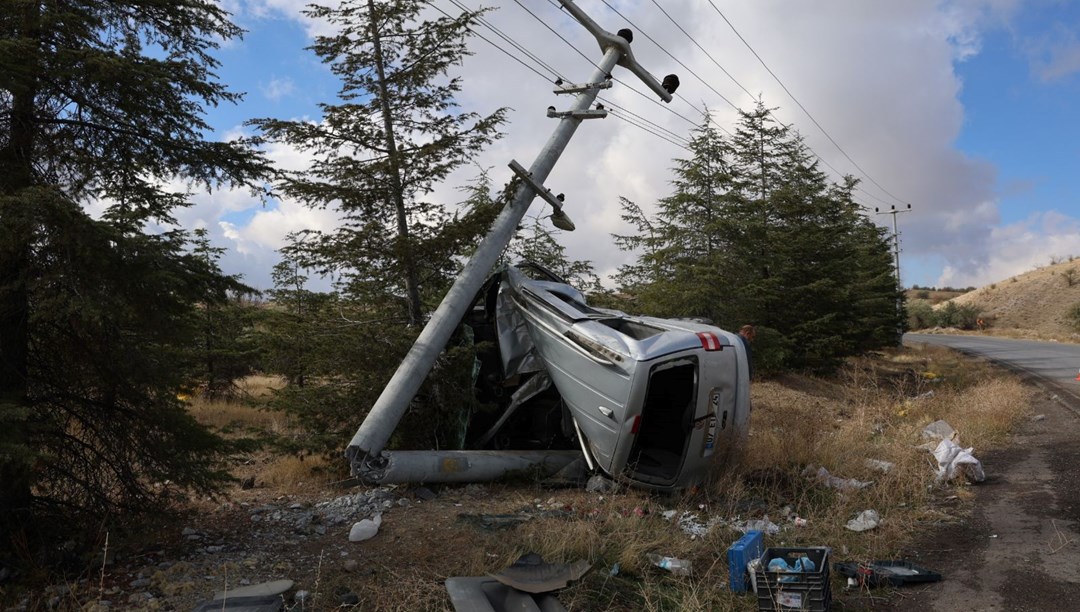Taklalar atan otomobil, yol kenarındaki elektrik direğine çarparak durabildi. Çarpmanın etkisiyle araç ikiye katlanırken, direk de kırıldı.