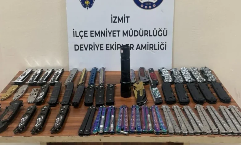 Yapılan aramada çocukların üzerinden 14 kelebek tabir edilen bıçak, 13 sustalı tabir edilen bıçak, 25 normal bıçak olmak üzere toplam 52 kesici alet ile ve şok cihazı ele geçirildi.