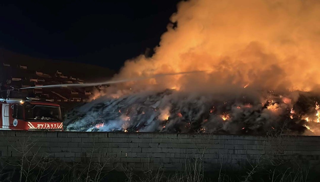 Yaklaşık 600 tonluk saman balyasının bulunduğu alanda, ekiplerin yangını söndürme çalışmaları devam ediyor.