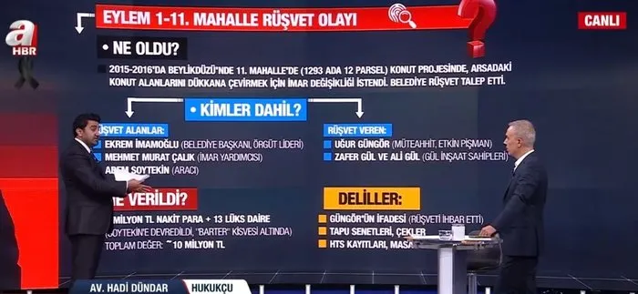 Bu şahıslarla ilgili, şimdi rüşvet alma, rüşvet verme, irtikap suçu, bunlar bireysel anlamda bazı şahıslar tarafından gidip şikayet edilmiş. Ancak oradaki savcılık makamları ya da oradaki yapılan araştırmalar eksik kaldığından dolayı bazıları ilerleyememiş ya da sürüncemede kalmış, halen araştırma durumları söz konusu. Yani Beylikdüzü’nde belediye başkanıyken de bu iddialar varmış. Bazıları var. Ama tamamı değil. Niye tamamı değil? Çünkü daha sonra etkin pişmanlıktan faydalanan, “aldım” ya da “verdim” diyen şahıslar ortaya çıktı. Burada niye bu kadar sayı daha sonra ortaya çıktı? Çünkü Ekrem İmamoğlu ile ilgili kamuoyunda bilgiler paylaşıldı. Bilgiler paylaşılınca şahıslar da cesaret aldılar. Gittiler dediler ki, “Ya ben de belediyeyle iş yaptım. Benden de para aldı. Al sana belgesi, al sana delili” diye söylediler. Burada da aynı şey söz konusu. Çünkü rüşveti veren kişi gidiyor diyor ki, “Ya ben burada rüşvet verdim.” Alan kişiye geliyorsunuz, Adem Soytekin, diyor ki burada etkin pişmanlık ifadesinde diyor ki, “Ben aldım.” Şimdi veren diyor, “Ben verdim.” Alan diyor, diyor ki, “Ben aldım.” Burada tamamen bir suçun oluştuğunu görebiliyoruz.