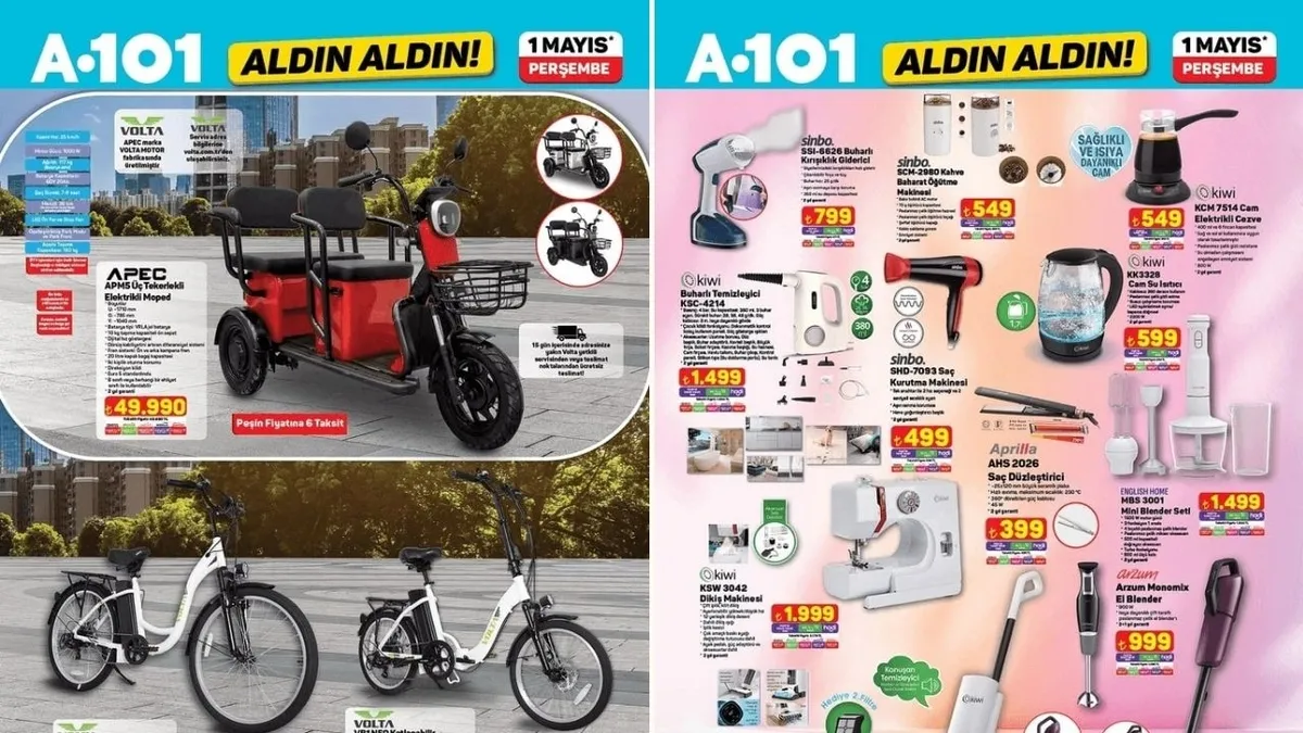 A101, 1 Mayıs 2025 Perşembe günü geçerli olacak yeni Aldın Aldın kataloğunu yayınladı. Bu haftanın öne çıkan ürünleri arasında kamp çadırı, basınçlı yıkama makinesi ve buharlı kırışıklık giderici dikkat çekiyor. Şarjlı süpürgeden katlanabilir elektrikli bisiklete kadar birçok indirimli ürün A101’de satışa sunulacak.