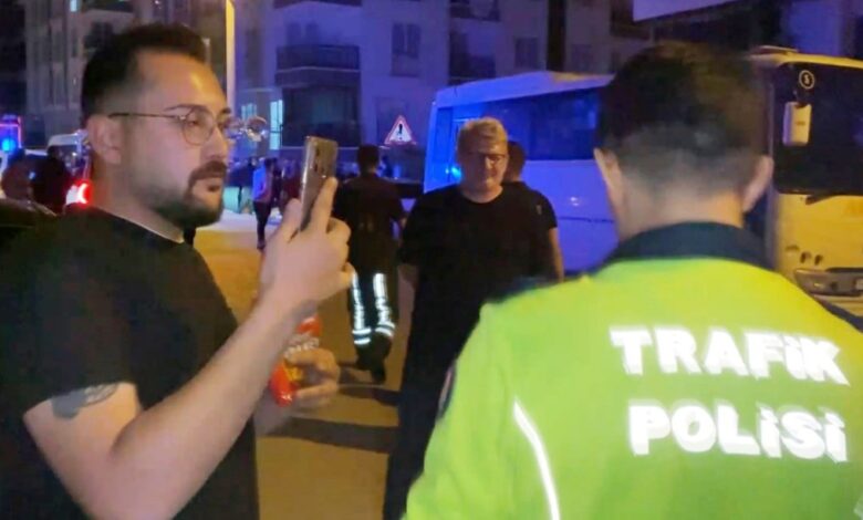 Görevini yapan polis memurlarına bağırıp elindeki cep telefonuyla memurların görüntüsünü kaydeden sürücü, bir yandan kraker yedi bir yandan da polis ekiplerine bağırdı.
