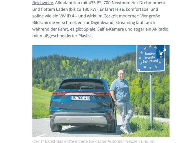 2023 yılından bu yana Gemlik’te üretilen T10X’in 60 bin adet üretildiğini yazan Auto Bild, “Türkiye’de Togg artık yollarda alışılan bir araç. Zaten araç, zamanında VW’de de çizgileri belirleyen Murat Günak tarafından dizayn edildi” yorumunu yaptı. Togg’un IAA’da tanıtıldıktan sonra 2026’da Almanya’da satılmaya başlanacağını yazan dergi, “Volkswagen ID.4, Tesla Model Y ve MG4 gibi rakiplerin bulunduğu segmentte Togg, fiyat avantajı ve dijital donanımlarıyla dikkat çekmeyi hedefliyor.