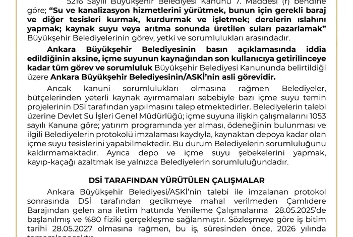 Öte yandan CHP Genel Başkanı Özgür Özel ise su kesintileri nedeniyle tepkilerin odağındaki Mansur Yavaş’ı savunarak sorumluluğun DSİ’de olduğunu öne sürmüştü. Özel’in iddialarına yönelik DSİ’den cevap geldi. DSİ yaptığı açıklamada 5216 sayılı Büyükşehir kanunun ilgili maddesini işaret ederek sorumluluğun Ankara Büyükşehir Belediyesi’nde olduğunu açıkladı.