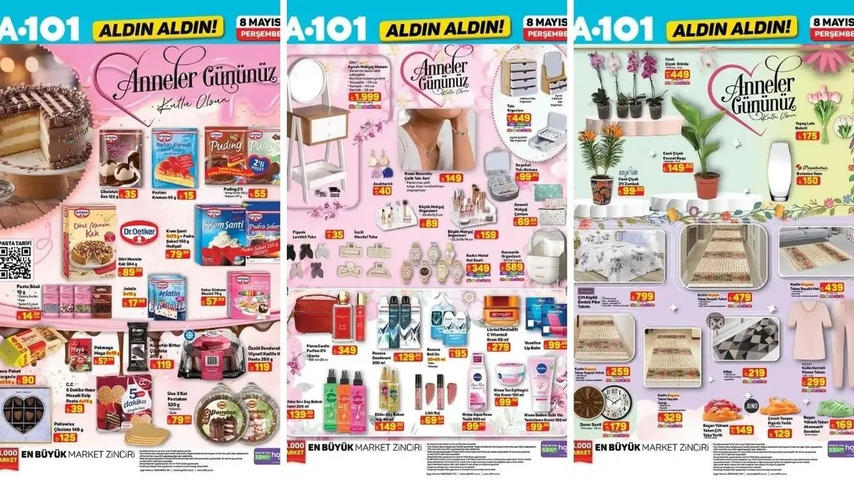 A101, her hafta büyük ilgi gören “Aldın Aldın” kampanyası kapsamında 8 Mayıs Perşembe günü raflara gelecek yeni aktüel ürünler kataloğunu yayımladı. Sınırlı sayıda satışa sunulan ve stoklarla sınırlı olan ürünler bu hafta Anneler Günü temasıyla dikkat çekiyor. Elektronikten küçük ev aletlerine, mutfak gereçlerinden kişisel bakım ürünlerine kadar birçok özel seçenek tüketicilerle buluşmaya hazırlanıyor.