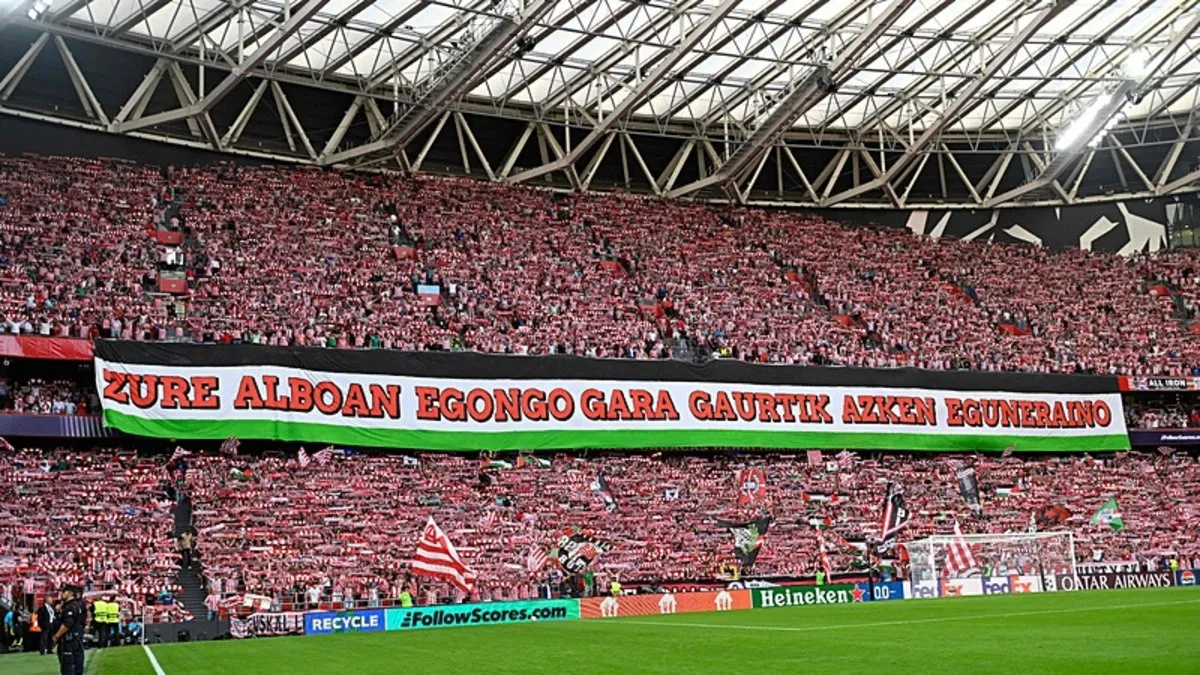 Estadio de San Mames Stadı’nda oynanan karşılaşmada İsrail’in işgali altındaki Filistin’e destek veren kırmızı-beyazlı takımın taraftarları, “Bugünden son güne kadar yanınızda olacağız” yazılı pankarta yer verdi.
