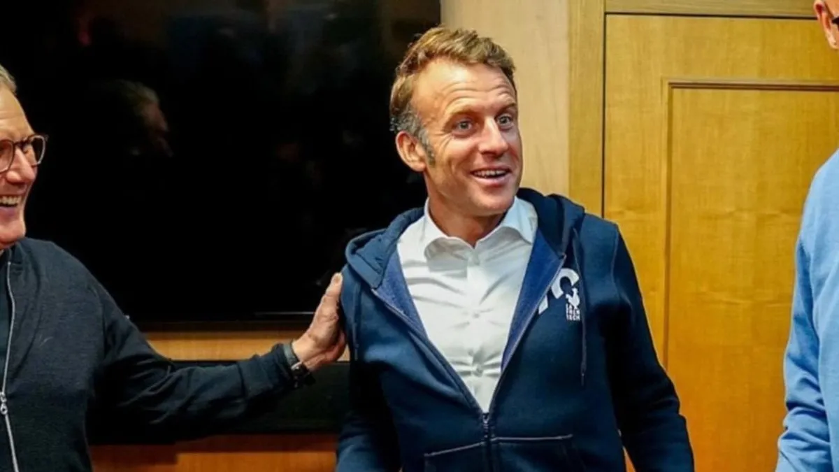 Görüntüde, Macron’un masa üzerindeki beyaz renkteki maddeyi eliyle sakladığı görülüyor.