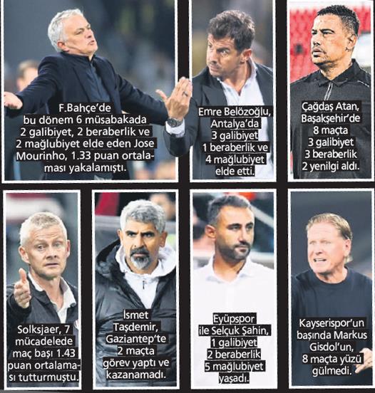Süper Lig’de teknik direktör ayrılıkları hız kesmiyor. 4 gün içinde 3 hoca takımlarına veda ederken 8 haftada gidenlerin sayısı 7’ye yükseldi. Gaziantep FK’da İsmet Taşdemir, Beşiktaş’ta Ole Gunnar Solskjaer, Fenerbahçe’de Jose Mourinho, Başakşehir’de Çağdaş Atan ile yollar ayrılırken son olarak Selçuk Şahin (Eyüpspor), Markus Gisdol (Kayserispor) ve Emre Belözoğlu’nun (Antalyaspor) biletleri kesildi. Geçen dönem ligde Ekim ayının ilk çeyreğinde 4 teknik adam ayılırken bu sene takımlarımız ayrılık şarkılarını çok daha fazla söyledi.