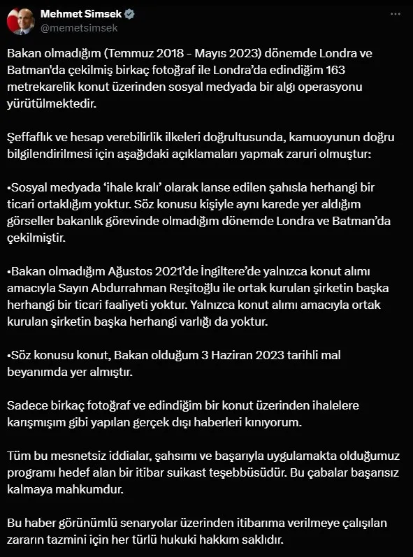 Hazine ve Maliye Bakanı Mehmet Şimşek’in hakkında çıkan iddialara verdiği cevap şu şekilde: