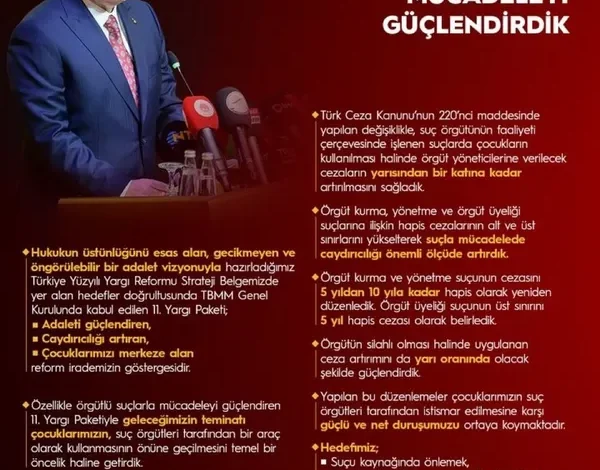 Bakan Tunç, 11’inci Yargı Paketi ile örgütlü suçlarla mücadelenin daha etkin hale getirildiğini belirterek, özellikle suç örgütlerinin çocukları istismar etmesinin önüne geçilmesinin temel hedeflerden biri olduğunu söyledi. Bu kapsamda Türk Ceza Kanunu’nun 220’nci maddesinde önemli değişiklikler yapıldığını aktaran Tunç, suç örgütünün faaliyeti çerçevesinde işlenen suçlarda çocukların kullanılması halinde örgüt yöneticilerine verilecek cezaların yarısından bir katına kadar artırıldığını ifade etti.