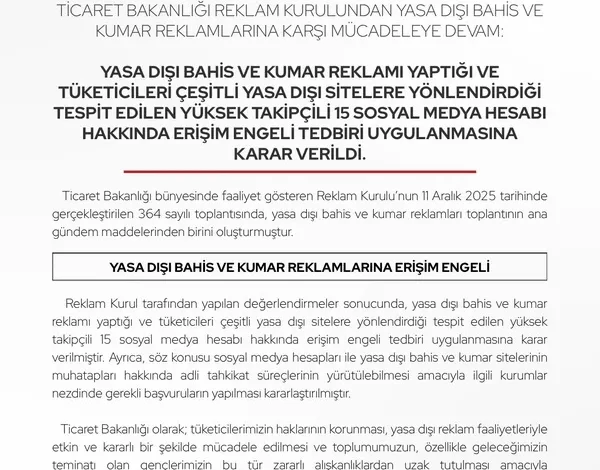 Yasa Dışı Bahis Ve Kumar Reklamı Yaptığı Ve Tüketicileri Çeşitli Yasa Dışı Sitelere Yönlendirdiği Tespit Edilen Yüksek Takipçili 15 Sosyal Medya Hesabı Hakkında Erişim Engeli Tedbiri Uygulanmasına Karar Verildi.”