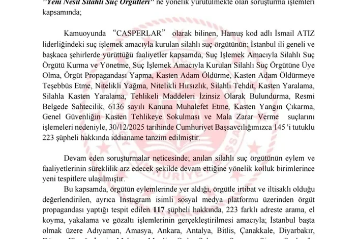 Kamuoyunda “CASPERLAR” olarak bilinen, Hamuş kod adlı İsmail ATIZ liderliğindeki suç işlemek amacıyla kurulan silahlı suç örgütünün; İstanbul ili geneli ve başkaca şehirlerde yürüttüğü faaliyetler kapsamda, Suç İşlemek Amacıyla Silahlı Suç Örgütü Kurma ve Yönetme, Suç İşlemek Amacıyla Kurulan Silahlı Suç Örgütüne Üye Olma, Örgüt Propagandası Yapma, Kasten Adam Öldürme, Kasten Adam Öldürmeye Teşebbüs Etme, Nitelikli Yağma, Nitelikli Hırsızlık, Silahlı Tehdit, Kasten Yaralama, Silahla Kasten Yaralama, Tehlikeli Maddeleri İzinsiz Olarak Bulundurma, Resmi Belgede Sahtecilik, 6136 sayılı Kanuna Muhalefet Etme, Kasten Yangın Çıkarma, Genel Güvenliğin Kasten Tehlikeye Sokulması ve Mala Zarar Verme suçlarını işlemeleri nedeniyle, 30/12/2025 tarihinde Cumhuriyet Başsavcılığımızca 145’i tutuklu 223 şüpheli hakkında iddianame tanzim edilmiştir.