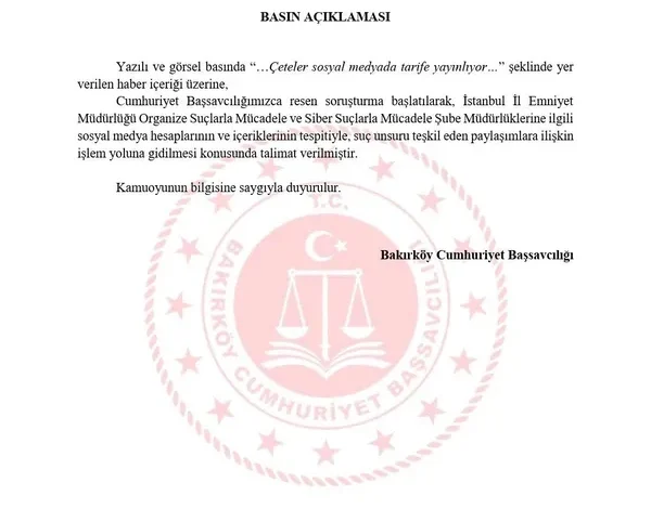 “Yazılı ve görsel basında “..çeteler sosyal medyada tarife yayınlıyor…” şeklinde yer verilen haber içeriği üzerine, Cumhuriyet Başsavcılığımızca resen soruşturma başlatılarak, İstanbul İl Emniyet Müdürlüğü Organize Suçlarla Mücadele ve Siber Suçlarla Mücadele Şube Müdürlüklerine ilgili sosyal medya hesaplarının ve içeriklerinin tespitiyle, suç unsuru teşkil eden paylaşımlara ilişkin işlem yoluna gidilmesi konusunda talimat verilmiştir. Kamuoyunun bilgisine saygıyla duyurulur”