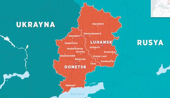 Ukrayna’nın doğusunda yer alan Donetsk ve Luhansk, savaşın anahtarı konumunda. Donetsk ve Luhansk’in yer aldığı Donbas bölgesi, zengin kömür rezervlerine sahip. Burası savaş öncesinde yaklaşık 6.5 milyon nüfusa sahipti. Rus ordusu ve Rusya yanlısı güçler, 2014’ten bu yana Donbas’ın yaklaşık yüzde 87’sini ele geçirdi.