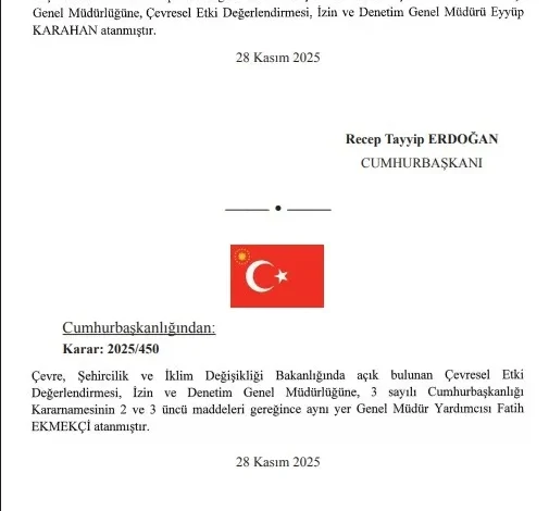 Görev değişikliği kapsamında İller Bankası A.Ş. Genel Müdürü Recep Türk görevden alınmış ve bu suretle boşalan İller Bankası A.Ş. Genel Müdürlüğüne, Çevresel Etki Değerlendirmesi, İzin ve Denetim Genel Müdürü Eyyüp Karahan atandı.
