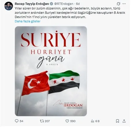 “Yıllar süren bir zulüm düzeninin, çok ağır bedellerin, büyük acıların, türlü zorlukların ardından Suriyeli kardeşlerimizi özgürlüğüne kavuşturan 8 Aralık Devrimi’nin 1’inci yılını yürekten tebrik ediyorum.” ifadelerinin yer aldığı mesajın tamamı şu şekilde: