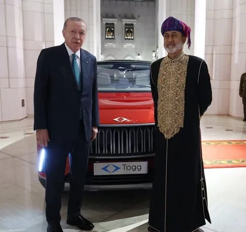 Başkan Erdoğan, Umman Sultanı Heysem bin Tarık bin Teymur El Said ile bir araya gelmesinin ardından kendisine kırmızı renkli Togg aracı hediye etti.