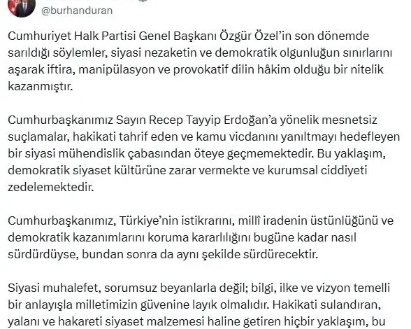 Cumhurbaşkanlığı İletişim Başkanı, Burhanettin Duran, CHP Genel BaşkanI Özgür Özel’in Başkan Erdoğan’a yönelik skandal sözlerine tepki göstererek şu ifadeleri kullandı: “Cumhuriyet Halk Partisi Genel Başkanı Özgür Özel’in son dönemde sarıldığı söylemler, siyasi nezaketin ve demokratik olgunluğun sınırlarını aşarak iftira, manipülasyon ve provokatif dilin hâkim olduğu bir nitelik kazanmıştır. Cumhurbaşkanımız Sayın Recep Tayyip Erdoğan’a yönelik mesnetsiz suçlamalar, hakikati tahrif eden ve kamu vicdanını yanıltmayı hedefleyen bir siyasi mühendislik çabasından öteye geçmemektedir. Bu yaklaşım, demokratik siyaset kültürüne zarar vermekte ve kurumsal ciddiyeti zedelemektedir. Cumhurbaşkanımız, Türkiye’nin istikrarını, millî iradenin üstünlüğünü ve demokratik kazanımlarını koruma kararlılığını bugüne kadar nasıl sürdürdüyse, bundan sonra da aynı şekilde sürdürecektir. Siyasi muhalefet, sorumsuz beyanlarla değil; bilgi, ilke ve vizyon temelli bir anlayışla milletimizin güvenine layık olmalıdır. Hakikati sulandıran, yalanı ve hakareti siyaset malzemesi haline getiren hiçbir yaklaşım, bu millete fayda getirmemiştir, getirmeyecektir.”