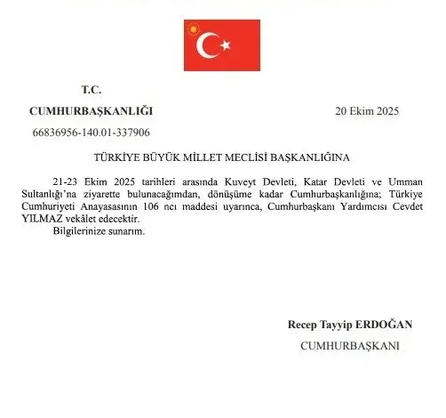 Başkan Recep Tayyip Erdoğan’ın 3 gün sürecek Körfez Turu dolayısıyla Cumhurbaşkanı makamına Cumhurbaşkanı Yardımcısı Yılmaz’ın vekalet edecek.