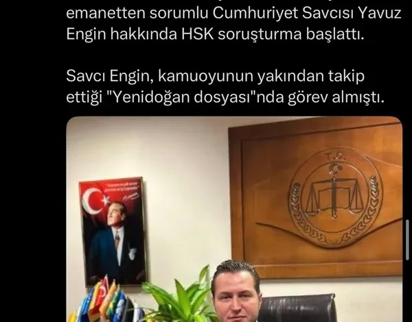 Büyükçekmece Cumhuriyet Başsavcılığı, bugün saat 15:43 sıralarında “BIRCANYILDIRIM” isimli X sosyal medya hesabından yapılan, “Büyükçekmece Adliyesi Emanet Kasasının soyulması nedeniyle emanetten sorumlu Cumhuriyet Savcısı Yavuz Engin hakkında HSK soruşturma başlattı. Savcı Engin, kamuoyunun yakından takip ettiği ‘Yenidoğan dosyası’nda görev almıştı“ paylaşım üzerine hesap sahibi hakkında ‘Halkı yanıltıcı bilgiyi alenen yayma’ suçundan re’sen soruşturma başlattı.