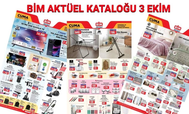BİM’de bu hafta yemek takımı, çay seti, kaşık-bıçak takımı, kek kalıbı gibi mutfak ürünlerinde kampanya fırsatı yaşanacak. Akıllı cep telefonu 7.990 TL, 55 İnç Google TV 14.990 TL, Mini Buzdolabı 4.990 TL, Elektrikli Süpürge 3.490 TL, Buharlı Temizleme Makinesi 4.390 TL, 48 Parça Yemek Takımı 3.750 TL’den satışa sunulacak. Alternatif olarak Çelik Çaydanlık 1.190 TL, Derin Çelik Tencere 899 TL, 24 Parça Çatal Kaşık Bıçak Takımı 1.490 TL, Döküm Kek Kalıbı ise 399 TL’den müşterileri bekleyecek. BİM marketlerinde ayrıca saç şekillendirme seti, kahve makinesi, erkek bakım seti, masaj aleti, blender seti gibi ürünler cuma günü gelecek. Peki BİM’de bu cuma neler var? İşte, 3 Ekim BİM Aktüel kataloğunda yer alan indirimler…