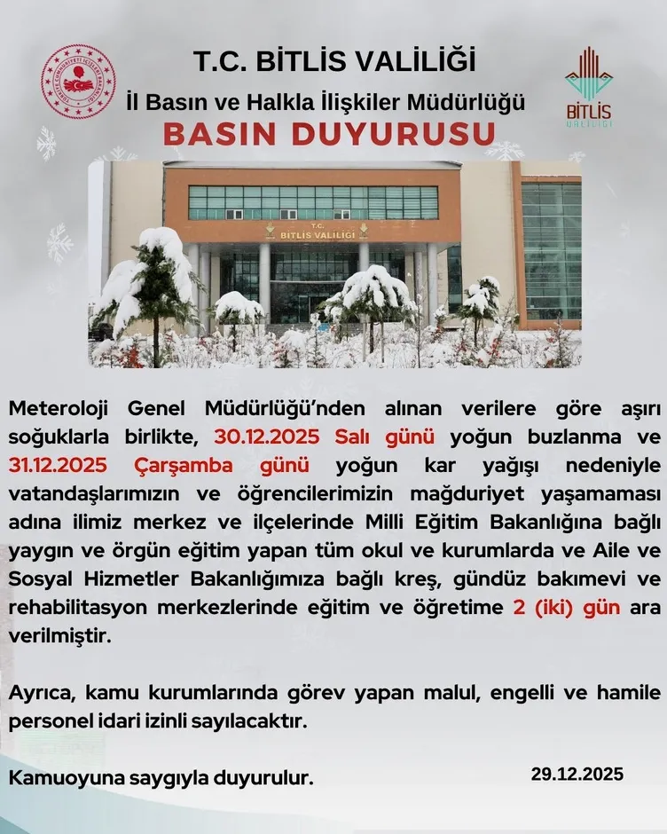 Açıklamada, “Meteoroloji Genel Müdürlüğü’nden alınan verilere göre aşırı soğuklarla birlikte, 30.12.2025 Salı günü yoğun buzlanma ve 31.12.2025 Çarşamba günü yoğun kar yağışı nedeniyle vatandaşlarımızın ve öğrencilerimizin mağduriyet yaşamaması adına ilimiz merkez ve ilçelerinde Milli Eğitim Bakanlığına bağlı yaygın ve örgün eğitim yapan tüm okul ve kurumlarda ve Aile ve Sosyal Hizmetler Bakanlığımıza bağlı kreş, gündüz bakımevi ve rehabilitasyon merkezlerinde eğitim ve öğretime 2 gün ara verilmiştir. Ayrıca, kamu kurumlarında görev yapan malul, engelli ve hamile personel idari izinli sayılacaktır” denildi.