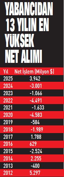 Endeksin performansının enflasyon ve alternatif yatırım araçlarına göre zayıf kaldığı 2025’te yabancıların piyasaya geri döndüğü dikkat çekti. Yabancılar 2025’te Borsa İstanbul’da 3 milyar 942 milyon dolarlık net alım gerçekleştirdi. Yabancılar böylece 2017’den beri ilk defa bir yılı net alımla tamamladı. Yabancılar ayrıca 2012’deki 5.3 milyar dolarlık net alımdan sonra 2025’te en yüksek alıma imza attı. 2025’in tamamında en fazla net alım 817.5 milyon dolarla Aselsan, 510.5 milyon dolarla Turkcell’de yapıldı. 2025’te en fazla net satış 248.4 milyon dolarla Sasa’da gerçekleştirildi.