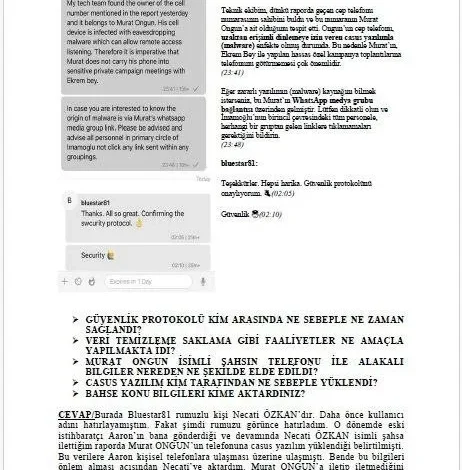 Hüseyin Gün, “O dönemde eski istihbaratçı Aaron’ın bana gönderdiği ve devamında Necati Özkan isimli şahsa ilettiğim raporda Murat Ongun’un telefonuna casus yazılım yüklendiği belirtilmişti. Bu verilere Aaron kişisel telefonlara ulaşması üzerine ulaşmıştı. Ben de bu bilgileri önlem alması açısından Necati’ye (Necati Özkan) aktardım. Murat Ongun’a iletip iletmediğini bilmiyorum. Ekrem İmamoğlu’nun katıldığı özel toplantılarda veri sızma ihtimaline karşı uyarmıştım. Bu bilgiler teknik ekibimin derin analizi sonucunda bana ulaştı. Ben de Necati Özkan’a bilgilendirme yaptım” ifadelerini kullandı.