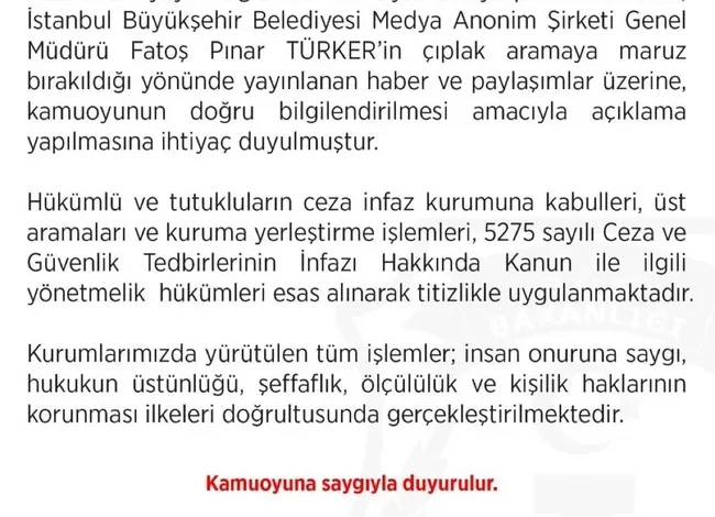 Kamuoyunu bilgilendirmek amacıyla yazılı açıklamaya yapan CTE, hükümlü ve tutukluların ceza infaz kurumuna kabulü, üst aramaları ve kuruma yerleştirme işlemlerinin 5275 sayılı Ceza ve Güvenlik Tedbirlerinin İnfazı Hakkında Kanun ile ilgili yönetmelik hükümleri esas alınarak titizlikle uygulandığını belirtti.