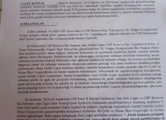 “Hatta Ertürk Çapın tarafından şahsıma “Ali Çelik ile Hasan İkbal’in başına gelenleri sen de yaşarsın” şeklinde tehdit içeren söylemler sarf edilmiştir. Seçim kazandıktan sonra Ertürk Çapın seçim öncesi vermiş olduğu sözü yerine getirmemiştir. Akabinde 2024 yılı başlarında CHP İzmir İl Başkan Yardımcısı olan Zeki Çağın ve CHP Bornova İlçe Başkanı Ertürk Çapın, tarafımla bir kafede buluşarak gerçekleşecek kongre kapsamında 31 Mart 2024 yerel seçimleri sonrasında İzmir Büyükşehir Belediyesi ve Bornova Belediyesi’nde istihdam sağlanacağı, ayrıca belirli bir meblağ karşılığında bağış yapılması halinde meclis üyeliklerinin garanti edileceği yönünde beyanda bulunmuşlardır. Hatta Zeki Çağın tarafından tarafıma ‘Ertürk başkanla görüştük, bizim için çalışan üyelerimize istihdam sözümüz var, ayrıca meclis üyesi olmak isteyen partililerimize de yapılacak bağışlar karşılığında yardımcı olacağız’ denmiştir.