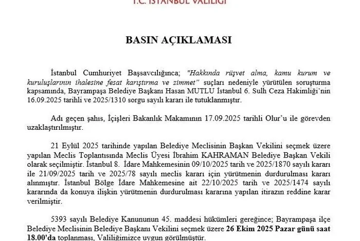 Valilik’ten yapılan açıklama şöyle: “İstanbul Cumhuriyet Başsavcılığınca; “Hakkında rüşvet alma, kamu kurum ve kuruluşlarının ihalesine fesat karıştırma ve zimmet” suçları nedeniyle yürütülen soruşturma kapsamında, Bayrampaşa Belediye Başkanı Hasan MUTLU İstanbul 6. Sulh Ceza Hakimliği’nin 16.09.2025 tarihli ve 2025/1310 sorgu sayılı kararı ile tutuklanmıştır. Adı geçen şahıs, İçişleri Bakanlık Makamının 17.09.2025 tarihli Olur’u ile görevden uzaklaştırılmıştır. 21 Eylül 2025 tarihinde yapılan Belediye Meclisinin Başkan Vekilini seçmek üzere yapılan Meclis Toplantısında Meclis Üyesi İbrahim KAHRAMAN Belediye Başkan Vekili olarak seçilmiştir. İstanbul 8. İdare Mahkemesinin 09/10/2025 tarih ve 2025/1870 sayılı kararı ile 21/09/2025 tarih ve 2025/78 sayılı meclis kararı için yürütmenin durdurulması kararı alınmıştır. İstanbul Bölge İdare Mahkemesine ait 22/10/2025 tarih ve 2025/1474 sayılı kararında da konuya ilişkin yürütmenin durdurulması kararına yapılan itirazın reddine karar verilmiştir. 5393 sayılı Belediye Kanununun 45. maddesi hükümleri gereğince; Bayrampaşa ilçe Belediye Meclisinin Belediye Başkanı Vekilini seçmek üzere 26 Ekim 2025 Pazar günü saat 18.00’da toplanması, Valiliğimizce uygun görülmüştür.”