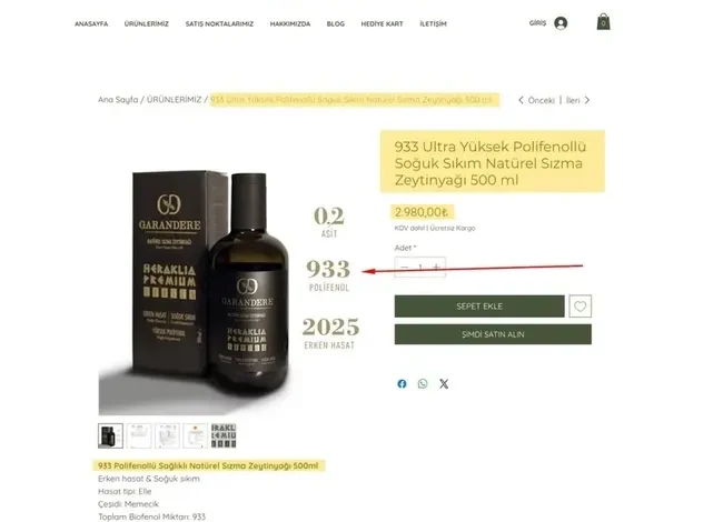 “Doğanın altın iksiri” gibi cezbedici cümleler ve “Heraklia Premium Series, 933 yüksek polifenol” etiketleriyle tüketiciyi aldatıyor.