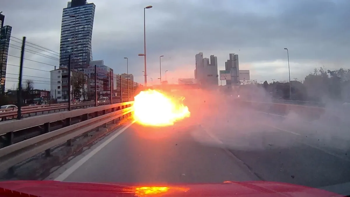 Şişli Mecidiyeköy D-100 Karayolu’nda makas atan bir sürücü, direksiyon hakimiyetini kaybederek bariyerlere çarptı. Çarpmanın ardından otomobil alev alırken, patlamayla kopan motor yola fırladı. Dehşet anları araç kamerasına saniye saniye yansıdı.