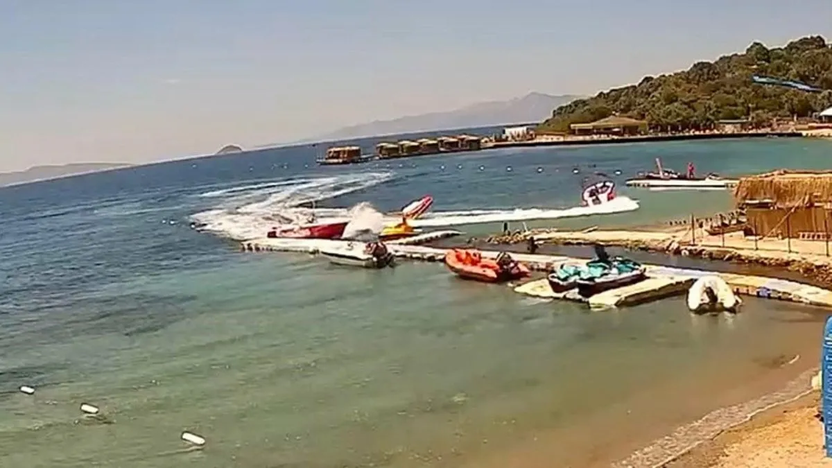 Kaza, öğle saatlerinde Bodrum’daki lüks bir otelin önünde bulunan su sporları alanında gerçekleşti. Su sporları işletmesine ait bir sürat teknesi tarafından çekilen deniz yatağı, parkur iskelesinde bağlı başka bir sürat teknesine hızla çarptı. Çarpmanın etkisiyle deniz yatağındaki turistler savrularak teknelere çarptı.