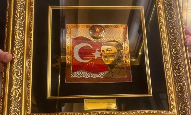 MHP Genel Başkanı Devlet Bahçeli, Cumhuriyetin 102. kuruluş yıl dönümü dolayısıyla Cumhurbaşkanı Erdoğan için yaptırdığı hediyeyi gönderdi.