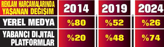 Türkiye’de reklam harcamalarında yerel basının payı 2014’te yüzde 80 iken, bu oran 2019 yılında yüzde 52’ye ve 2024 yılında yüzde 26’ya düştü. 2014 yılında bu oranın yüzde 20’sine sahip olan yabancı dijital platformlar, 2019’da yüzde 48, 2024’te ise yüzde 74 seviyelerine ulaştı. 2024’te yabancı medya platformlarının sadece Türkiye pazarından kazandığı para yaklaşık olarak 158 milyar lira oldu.