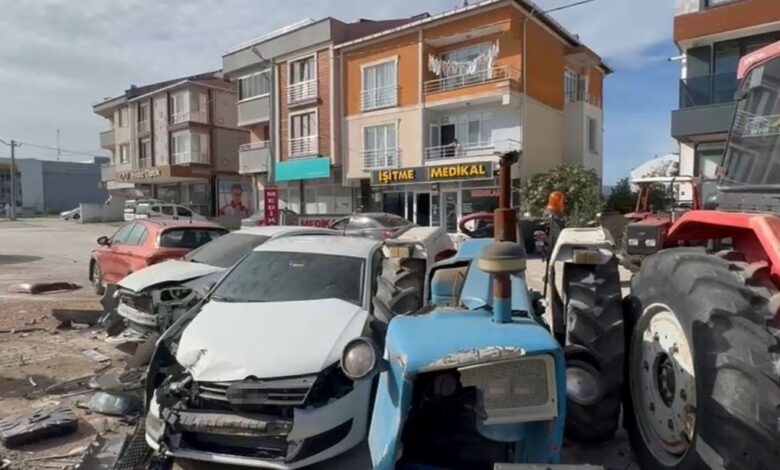 Gündoğdu Mahallesi Devlet Hastanesi çevre yolunda Y.A.’nın (29) kullandığı TIR, kontrolden çıkarak yol kenarında park halinde bulunan 4 otomobil ve 4 traktöre çarptı.