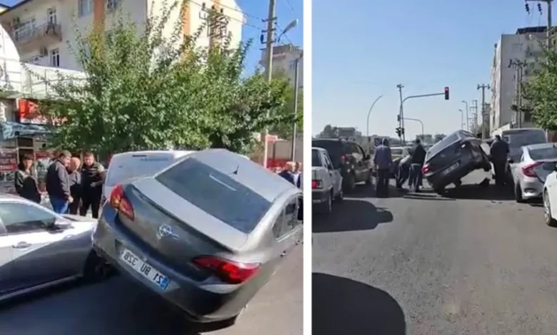 Diyarbakır’da ilginç kaza: Park halindeki 2 araca çarpıp asılı kaldı