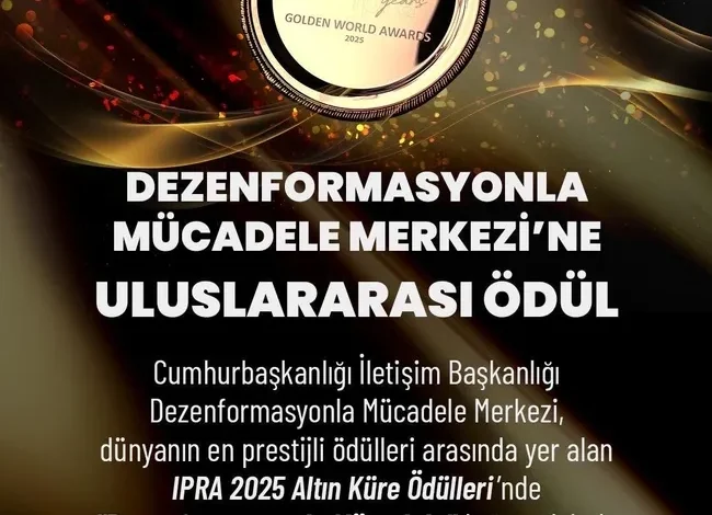 “Başkanlığımız bünyesinde faaliyetlerini sürdüren Dezenformasyonla Mücadele Merkezimiz, 2025 yılı Uluslararası Halkla İlişkiler Derneği (IPRA) tarafından düzenlenen Altın Küre Ödülleri kapsamında ‘Dezenformasyonla Mücadele’ kategorisinde ödüle layık görüldü. Bu anlamlı başarıda emeği geçen tüm mesai arkadaşlarıma teşekkür ediyorum.