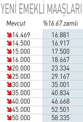 En düşük emekli aylığı için TBMM’de yasal düzenleme yapılacak. AK Parti Grup Başkanı Abdullah Güler, dün düzenlediği basın toplantısında 14 bin 469 lira olan en düşük emekli aylığının, yüzde 16.67 artışla 16 bin 881 liraya çıkarılacağını söyledi. Torba teklife eklenecek düzenleme, haftaya yasalaşacak. 4 milyon 11 bin kişinin maaşını artıracak bu düzenlemenin maliyeti 40.8 milyar lira olacak. Zamlı maaşlar, temmuz ayının ikinci yarısında emeklilerin hesaplarına yatırılacak. SSK emeklileri, 17-26 Temmuz tarihleri arasında; Bağ-Kur emeklileri ise 25-28 Temmuz arasında zamlı ödemelerini alacak. Emekliler bu yılın ocak ayında yüzde 15.75 oranında zam almıştı.