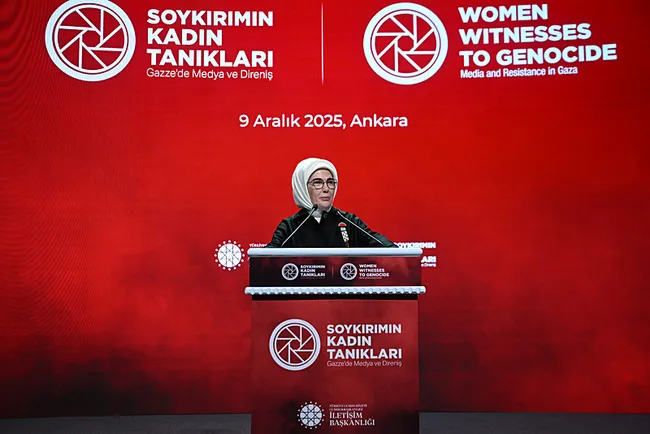 Bu gerçeğin, salondaki herkese çok önemli bir sorumluluk yüklediğine işaret eden Emine Erdoğan, “O da her zamankinden çok daha güçlü bir iletişim stratejisi yürütmektir. Dünyanın tüm kıtalarında hakikatin sesini yükseltmek, gerçeğin tercüme edilmediği tek bir lisan bile bırakmamaktır. Çünkü şehit olan Filistinli kardeşlerimiz çok üzülerek ifade ediyorum ki hayata, insanlığa gönül koyarak veda ettiler. O nedenle haksızlığa, yalana, adaletsizliğe, ayrımcılığa, soykırıma ve cümle kötülüğe savaş açmak, hepimizin en meşru savaşıdır.” ifadelerini kullandı.