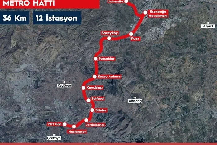 YHT Gar-Kuyubaşı-Esenboğa Havalimanı Metro Hattı’nı 36 kilometre uzunluğunda projelendirdiklerini söyleyen Bakan Uraloğlu, “Hat kapsamında; YHT Gar, Hastane, Demirlibahçe, Siteler, Solfasol, Kuyubaşı, Kuzey Ankara, Pursaklar, Sarayköy, Fuar, Esenboğa ve Yıldırım Beyazit Üniversite olmak üzere 12 istasyon bulunacak.” açıklamasında bulundu.
