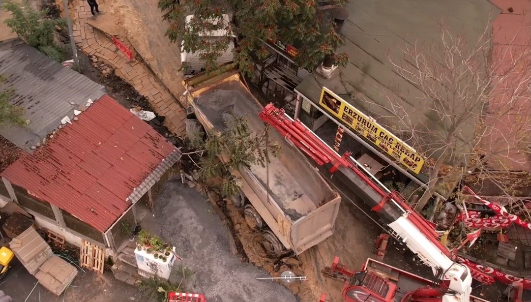 Hafriyat kamyonunun çamura saplandığı esnada yan tarafta bulunan çay ocağının duvarına zarar verdi. İhbar üzerine olay yerine ekip sevk edildi. Hafriyat kamyonu daha sonra vinç yardımıyla saplandığı yerden çıkarıldı. Çalışmaların yapıldığı anlar ise havadan görüntülendi.