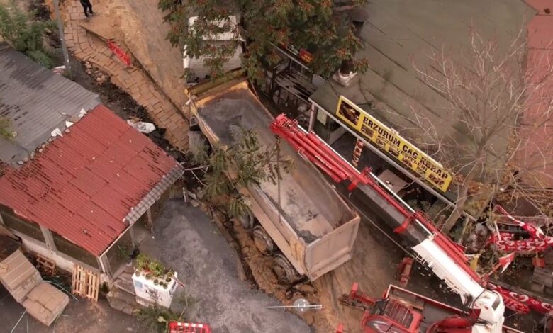 İstanbul Eyüpsultan‘da elektrik çalışması hattında yapılan kazı alanına düşen hafriyat kamyonu, vinç yardımıyla bulunduğu yerden kaldırıldı.