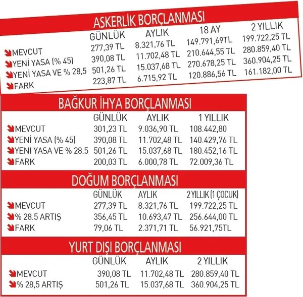 Yeni yılla birlikte hem oranların yüzde 45’e çıkması hem de asgari ücretin artması borçlanma miktarlarını da yükseltecek. Oysa bu yıl bitmeden borçlanma başvurusu yapanlar mevcut rakamlardan ödeme yapacağı için kazançlı çıkacak. Böylece daha az ödeyecek.