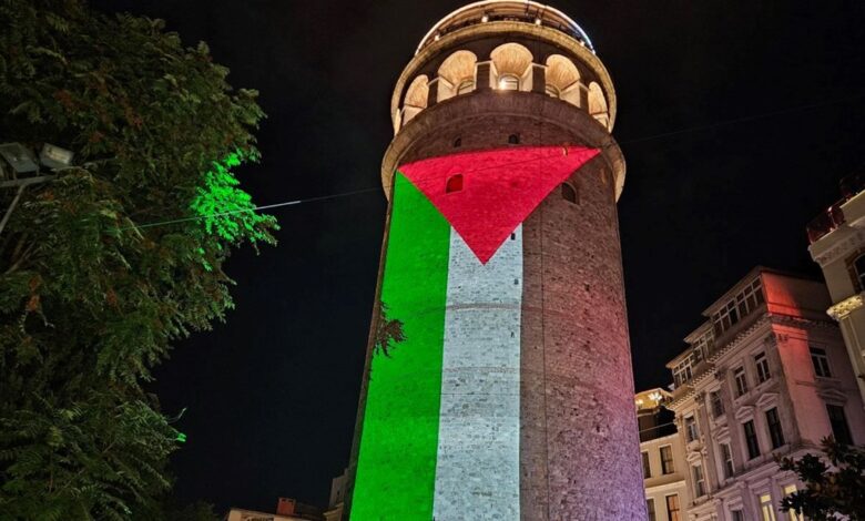 Kültür ve Turizm Bakanlığınca, Gazze‘de yaşanan saldırı, işgal ve soykırıma dikkat çekmek amacıyla Galata Kulesi’ne Filistin Bayrağı yansıtıldı.