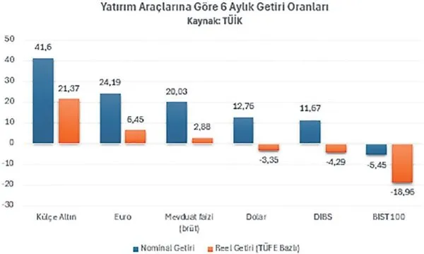 İlk 6 ayda finansal yatırım araçlarında en yüksek getiriyi altın sağladı. Külçe altın, TÜFE’ye indirgendiğinde yatırımcısına ocak-haziran döneminde % 21.37 oranında reel getiri sundu. Altını % 6.45’le euro, % 2.88’lik reel getiriyle brüt mevduat faizi izledi. Dolar, borsa ve DİBS ise yatırımcıyı üzdü
