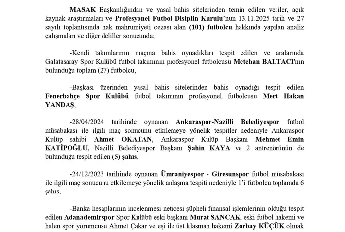 MASAK Başkanlığından ve yasal bahis sitelerinden temin edilen veriler, açık kaynak araştırmaları ve Profesyonel Futbol Disiplin Kurulu’nun 13.11.2025 tarih ve 27 sayılı toplantısında hak mahrumiyeti cezası alan (101) futbolcu hakkında yapılan analiz çalışmaları ve diğer deliller sonucunda;