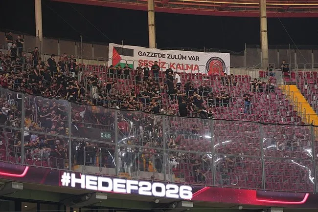 Fatih Karagümrük taraftarlarının olduğu misafir takım tribününde de, “Gazze’de zulüm var sessiz kalma” yazılı pankart yer aldı.