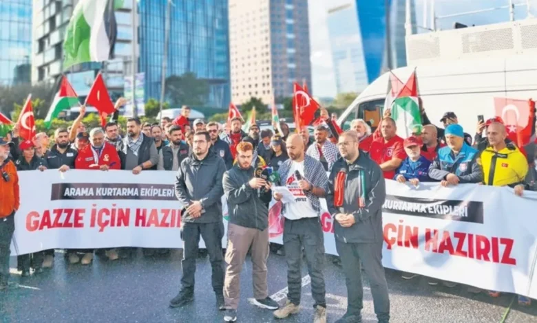 İstanbul’daki arama kurtarma ekipleri, Gazze için bir araya geldi. Yenikapı Etkinlik Alanı’nda buluşan arama kurtarma timleri ve binlerce gönüllü çok sayıda araç ve motosikletten oluşan konvoyla Levent’teki İsrail Konsolosluğu’nun önüne gitti. Burada konuşan Kadir Şeker, “Bizler, Türkiye’deki arama-kurtarma ekipleri olarak, yardımların kesintisiz ulaşması gerektiğini ve hala enkaz altında bulunan şehit cenazelerinin çıkartılması için gönüllü olduğumuzu vurgulamak istiyoruz” dedi. İSMAK Genel Başkanı Erdoğan Ersoy, “İstanbul’da 100, Türkiye genelinde 600 kişilik bir ekibimiz var. Gazze’deki barıştan çok mutluyuz. Devletimizin vereceği görevlere daim hazırız” derken BÖRÜ Arama Kurtarma Derneği Genel Başkanı Bilal Battal ise, “Arama kurtarma dernekleri olarak Gazze için buradayız” diye konuştu.